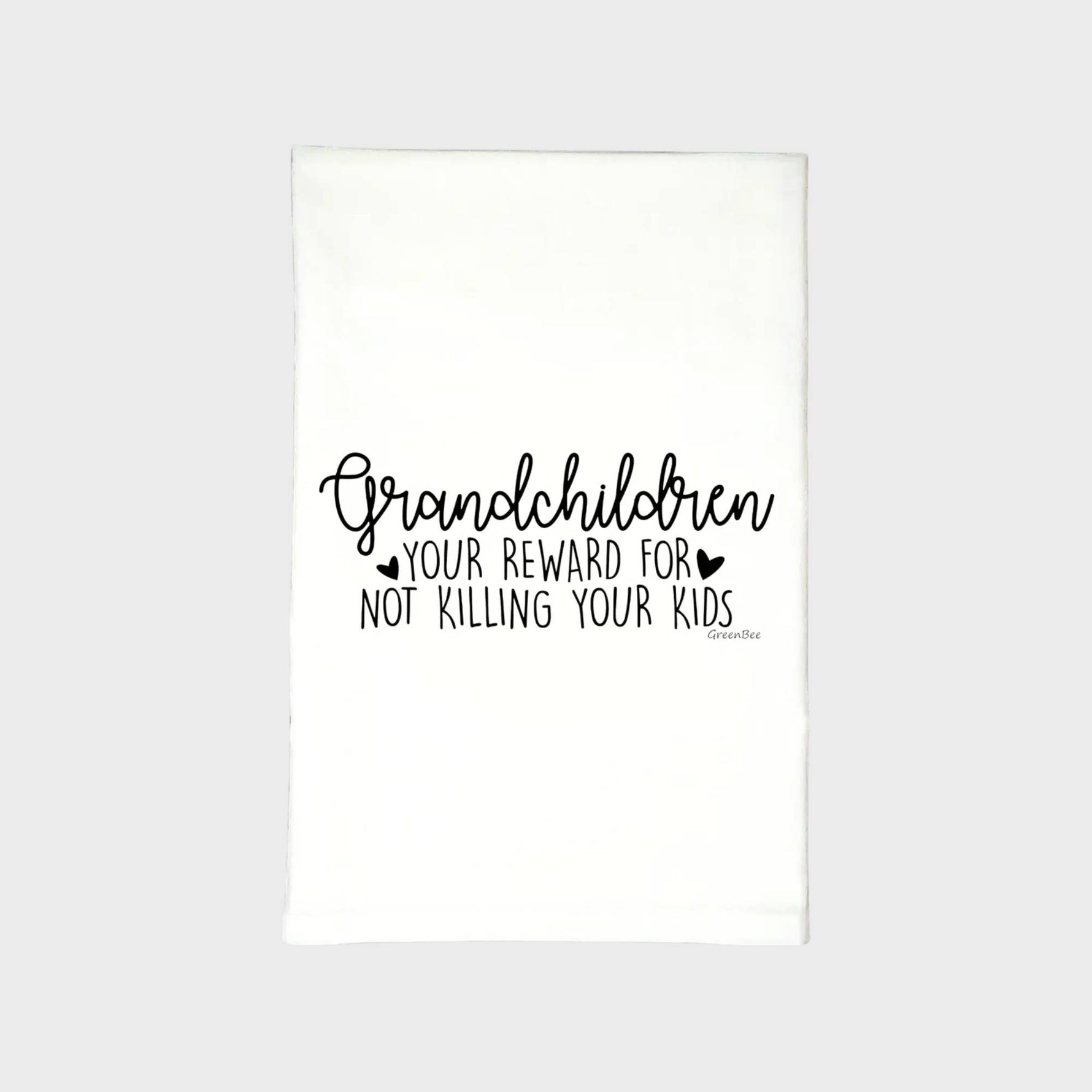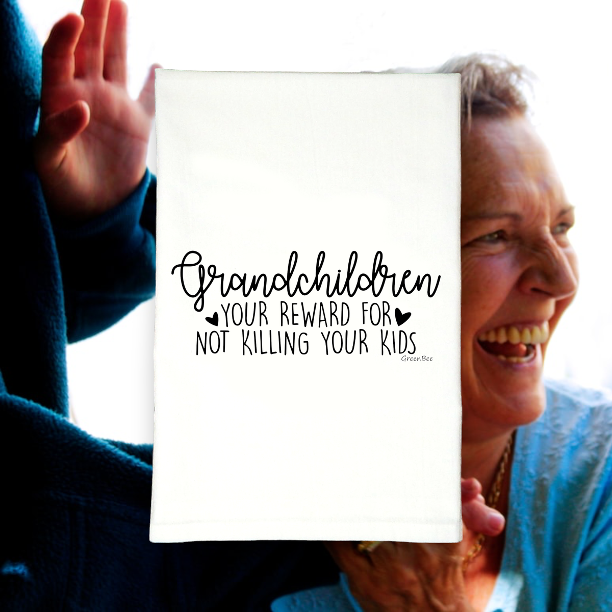 This 'Grandchildren Reward Not Killing Kids Funny Kitchen' tea towel is a low maintenance tea towel for high maintenance messes.