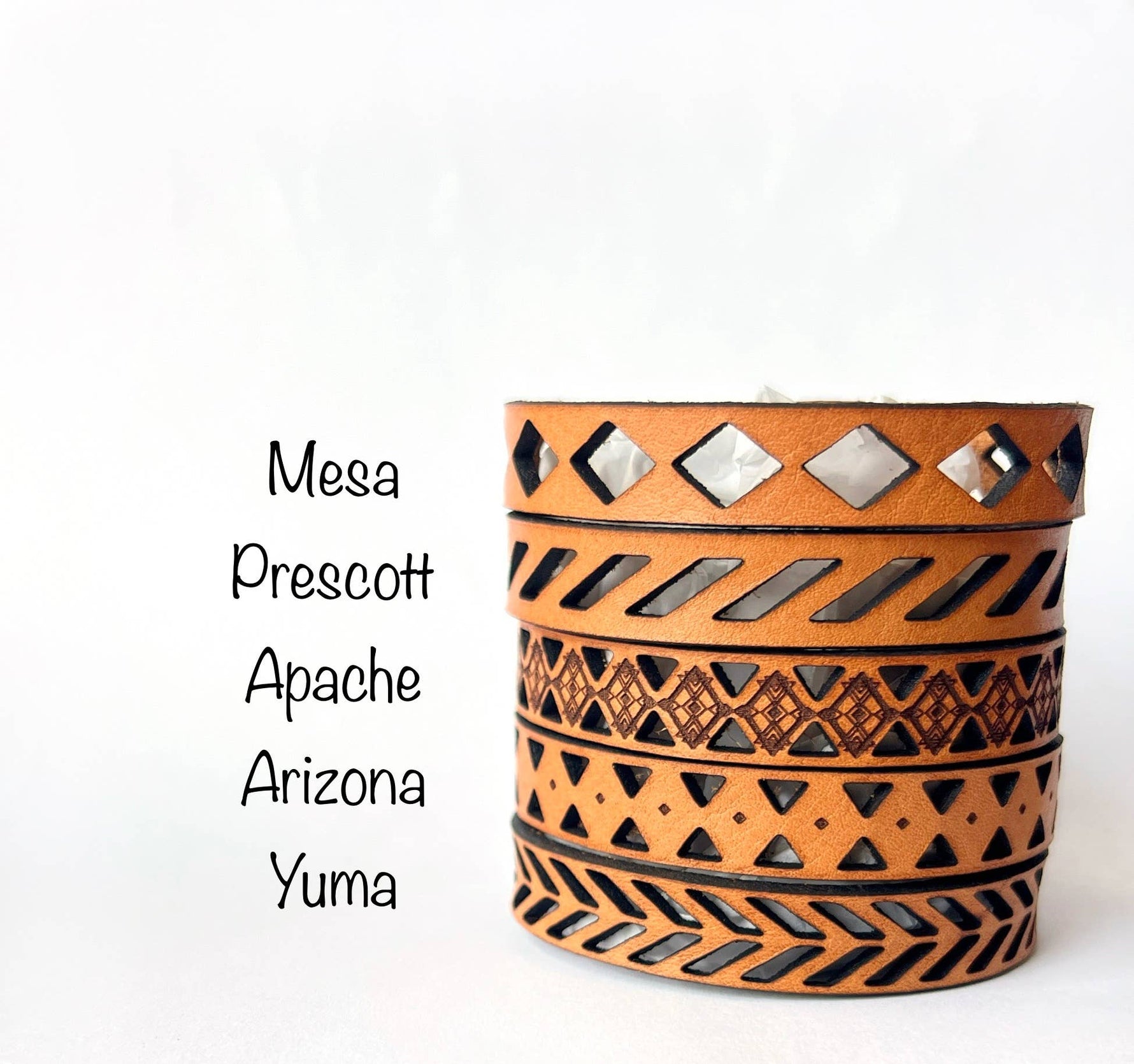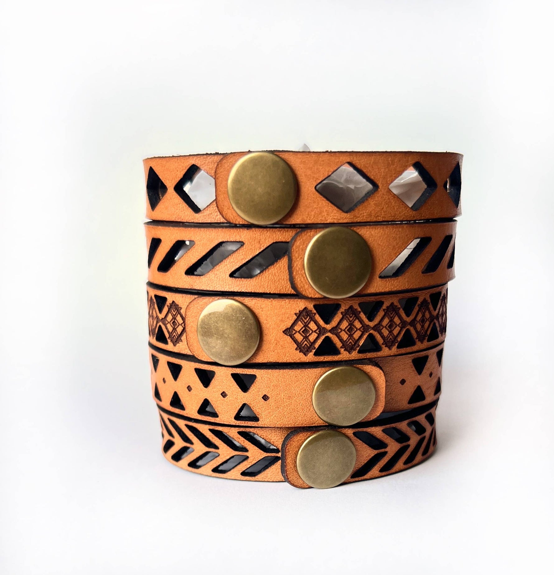 Western Boho Engraved Leather Bracelet Choose Specific Design 1/2” wide 8 1/2" size. (can be customized) Brass Snap closure This bracelet cuff is made from premium, full grain leather from our local leather shop. We hand select each hide for quality. Your bracelet is then laser cut, engraved by us, and finished with solid brass snap for a long lasting touch. It's comfortable and lightweight, making it great for everyday wear. Each piece of leather is different, please allow for slight differences in appearance, making each one unique.