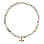 • Materials: 4mm semi-precious faceted stone beads, brass logo charm, stretch cord.