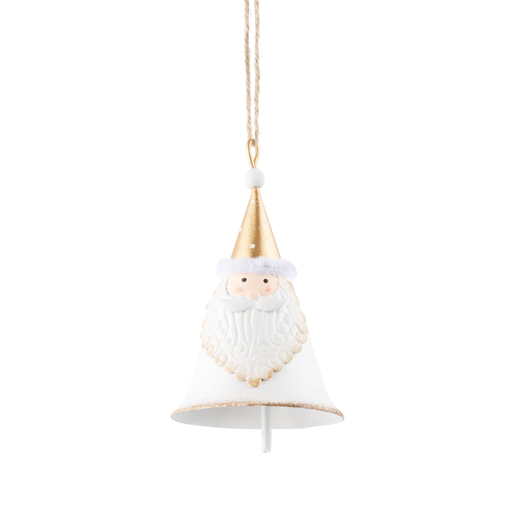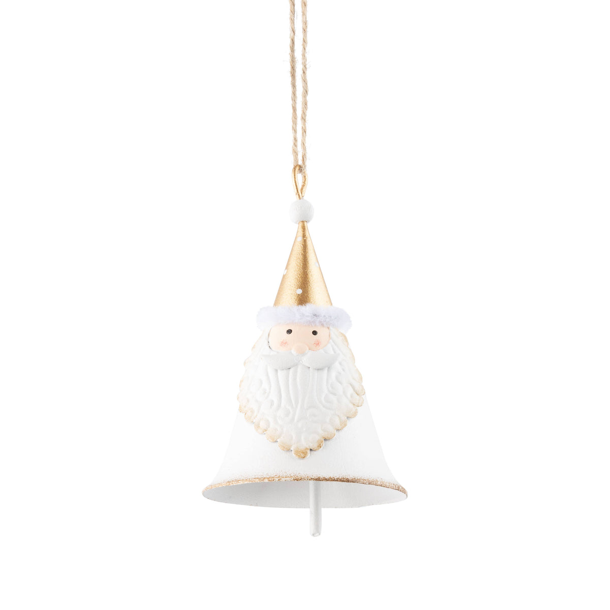 Metal Santa bell ornament,white bell with gold hat,4in. Please note that due to the nature of the materials,slight color variations may occur between individual items and compared to images. These differences are minimal and do not affect the overall appearance.