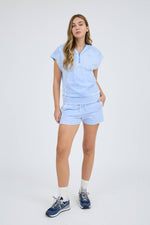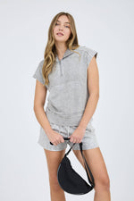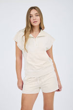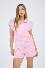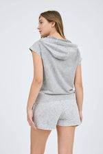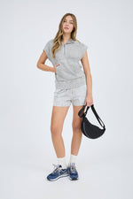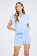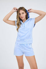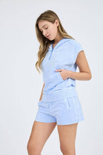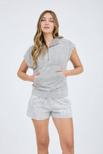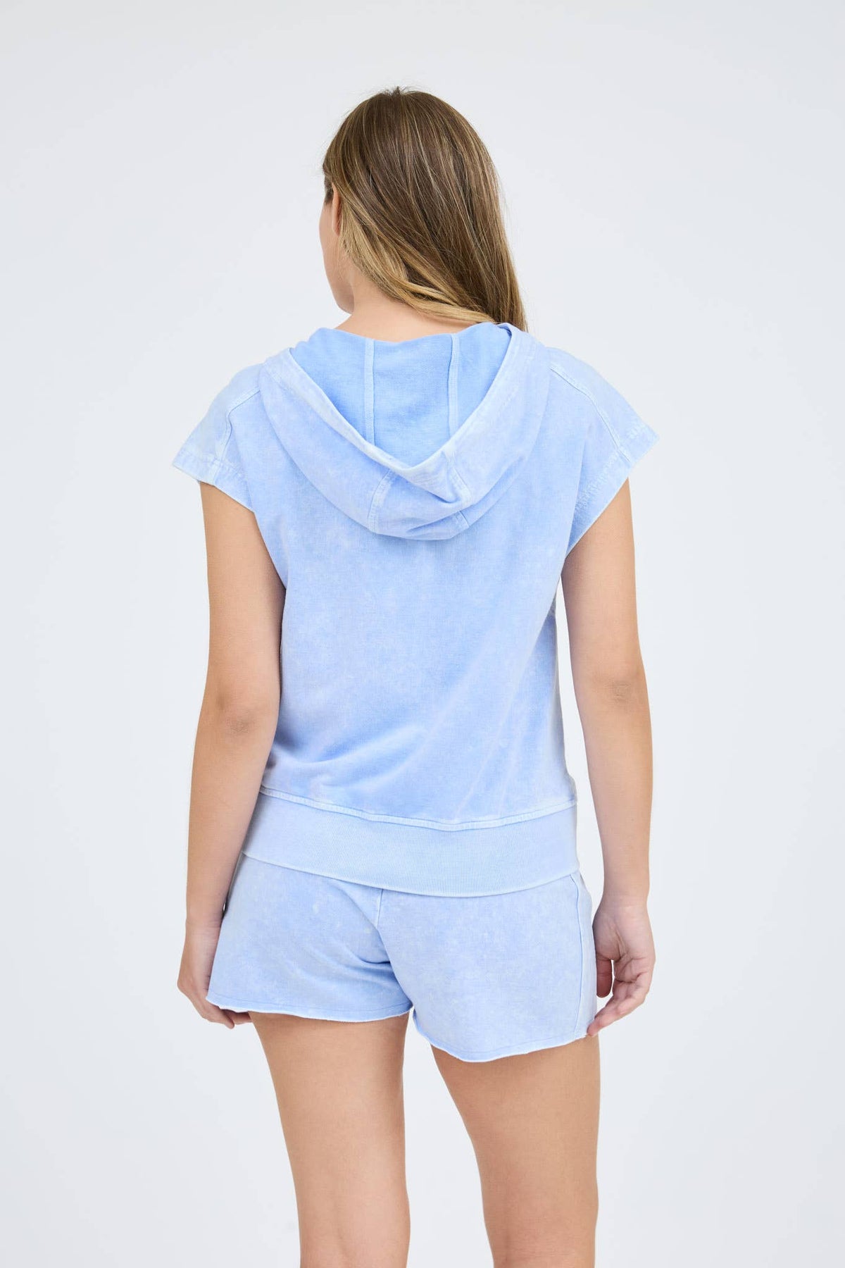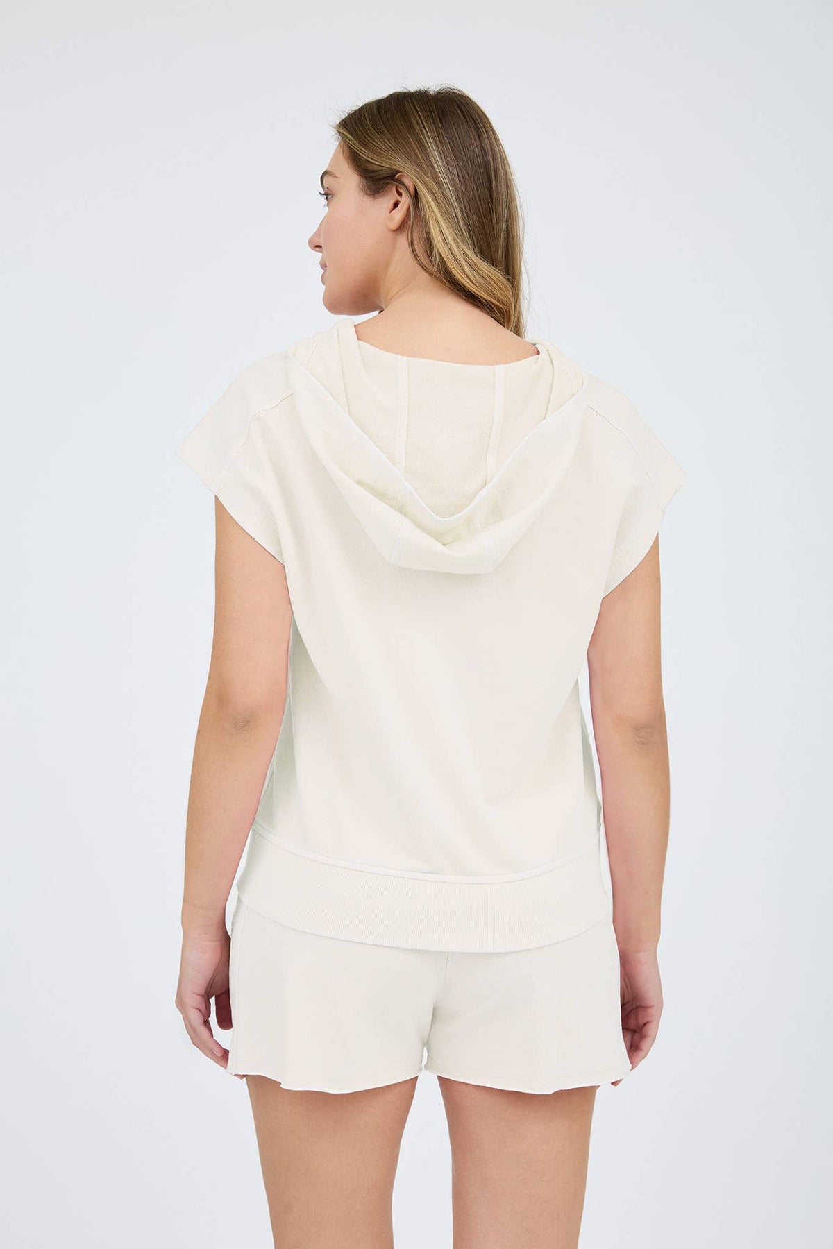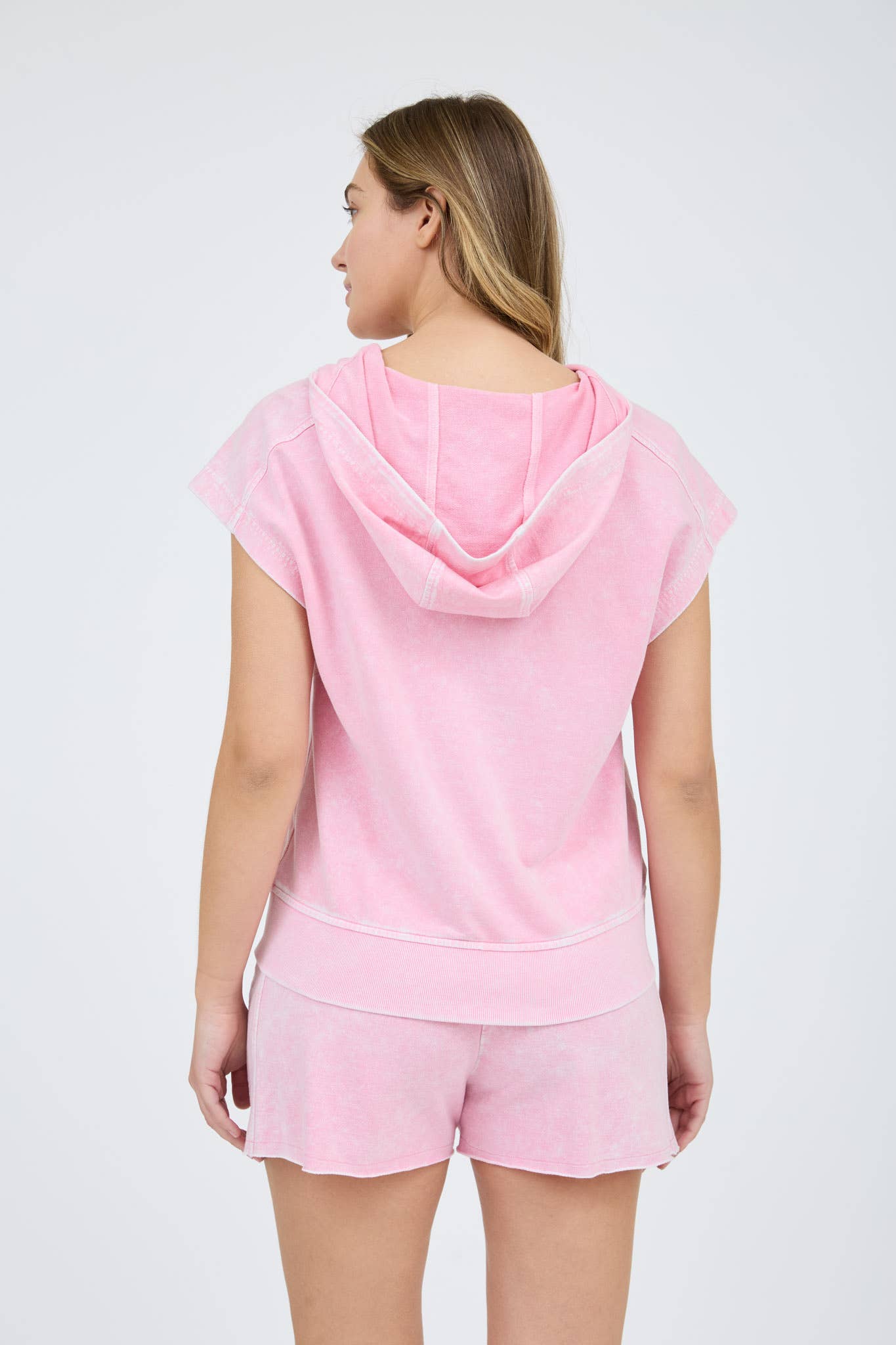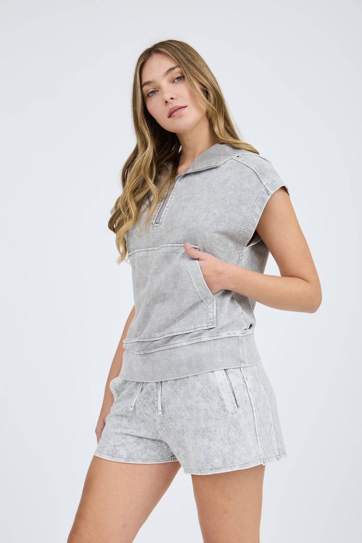Unit price / perHIGH NECK HOODED HALF ZIP LARGE FRONT POCKET SHORT SLEEVES WASHED PATTERN NOT LINED KNIT TOP SELF: 60% COTTON, 40% POLYESTER CONTRAST: 57% COTTON, 38% POLYESTER, 5% SPANDEX